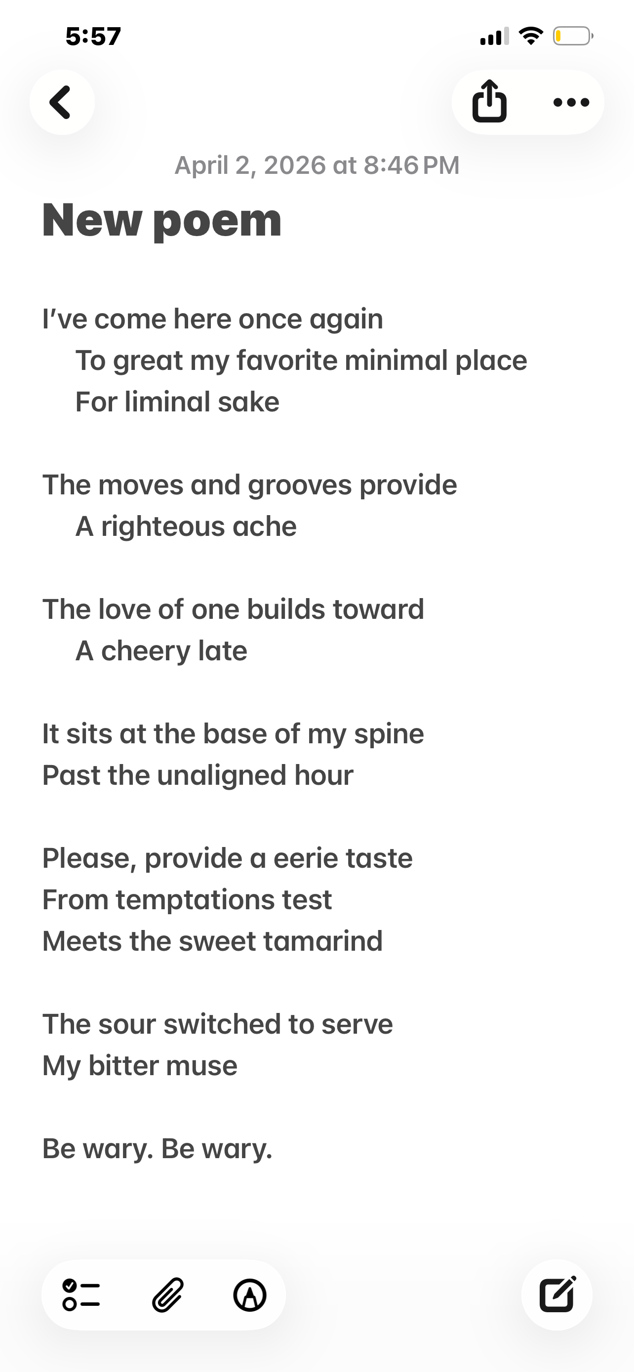 dive under wet tithes' knewIn “Sisna,” the speaker chooses submersion over the alternative, which is to keep rolling over the jagged edge indefinitely. Ponder cries is a chosen submersion; the sound of someone facing what the gallop could have endlessly deferred. The question arrives in retrospect; fear traveled the road as sound, passing through unnamed while the gallop still held. The wind muscling the earth to drop is the external world confirming what the interior already knows. After all that churning (the bruise, the forced gaze, the wines and dines of grief), survival turns into the beautiful. One may say “good morning” and life flowers: